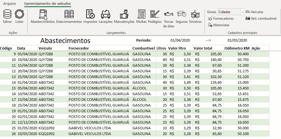 São 10 tipos de despesas: Abastecimentos, Estacionamentos, Impostos, Lavações, Manutenções, Multas, Pedágios, Trocas de Óleo, Seguro e Sinistros. Todas com os seus devidos controles separados e acessados rapidamente pelo menu do sistema retornando os dados do banco de dados Access do sistema. https://loja.guiadoexcel.com.br/wp-content/uploads/2021/03/Planilha-de-Controle-e-manutencao-de-veiculos-Excel-3-lancamentos.gif