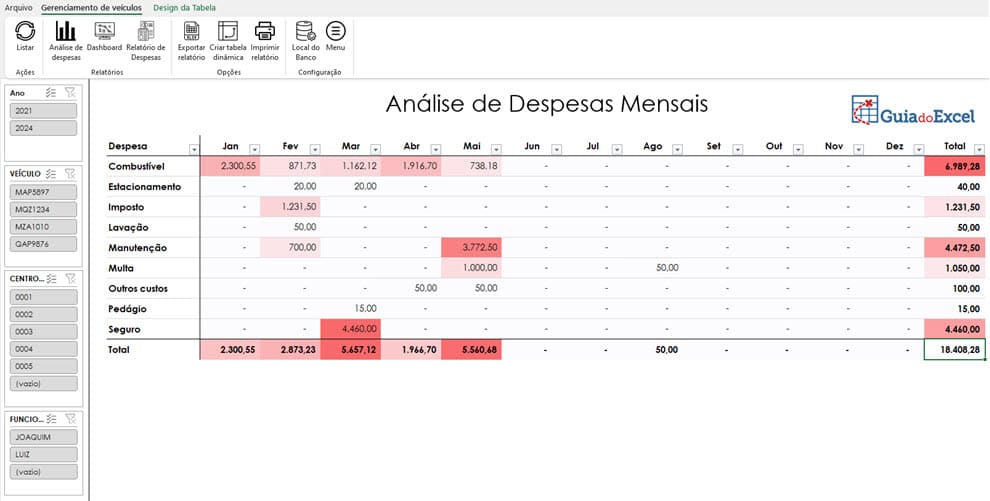 1. Totais anual e mensal e comparativo para despesas de combustível, estacionamento, imposto, lavação, manutenção, multa, pedágio e seguro, com a finalidade de controlar os gastos e identificar anormalidades.
